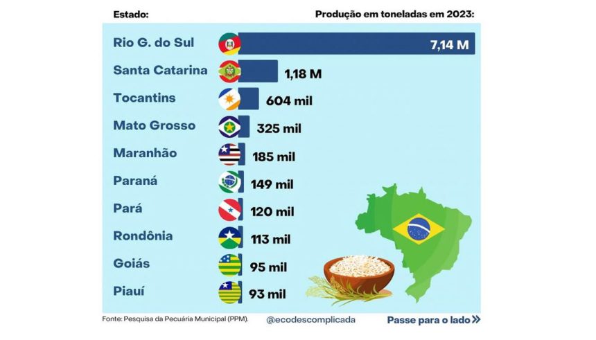 O Tocantins produziu 604 mil toneladas de arroz em 2023, consolidando-se como o terceiro maior produtor do país, de acordo com a Pesquisa da Pecuária Municipal (PPM). O desempenho coloca o estado atrás apenas do Rio Grande do Sul (7,14 milhões de toneladas) e de Santa Catarina (1,18 milhão de toneladas).