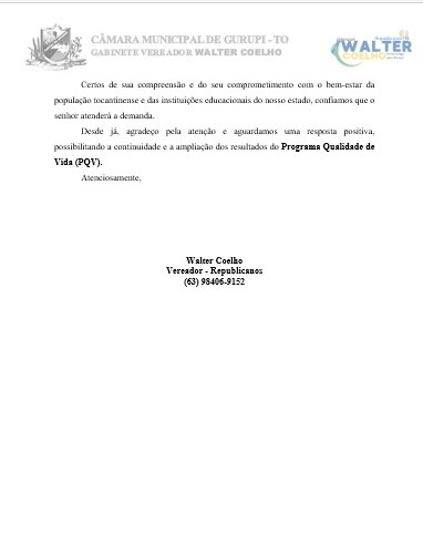 “Fui muito bem recebido pelo senador Eduardo gomes, que sempre se mostrou parceiro de Gurupi. Acredito que este ano ainda nós estaremos inaugurando esse espaço de lazer e saúde”, afirmou Walter Coelho. A ação faz parte do Programa Qualidade de Vida (PQV) idealizado pelo vereador e que vem promovendo atividades físicas, esportivas e de saúde para servidores, professores e acadêmicos da Universidade de Gurupi, desde 2023.