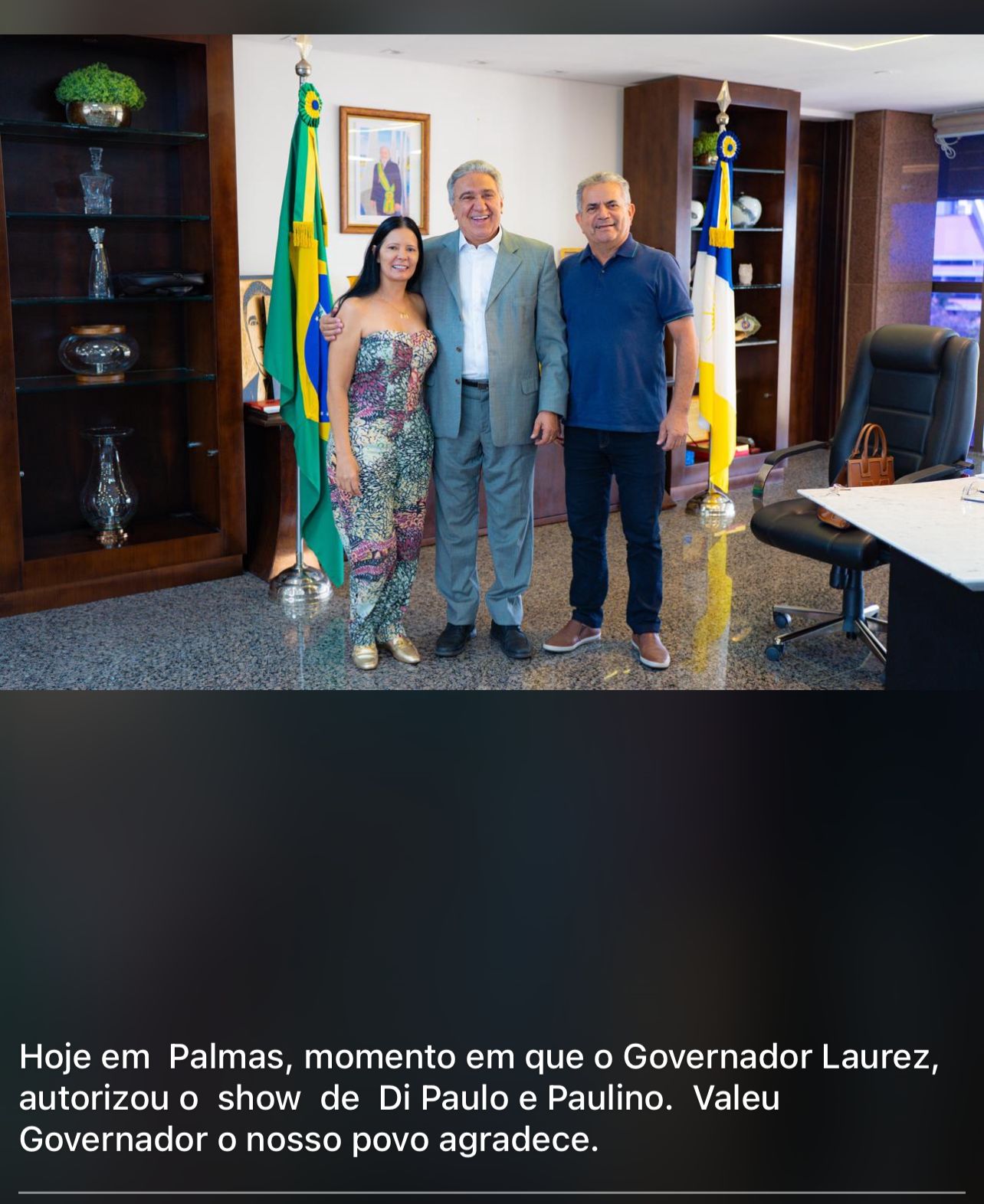 “Hoje em Palmas momento em que o governador Laurez Moreira autorizou o show de Di Paulo & Paulino. Valeu governador o nosso povo agradece” disse Fontoura em publicação nas redes sociais.