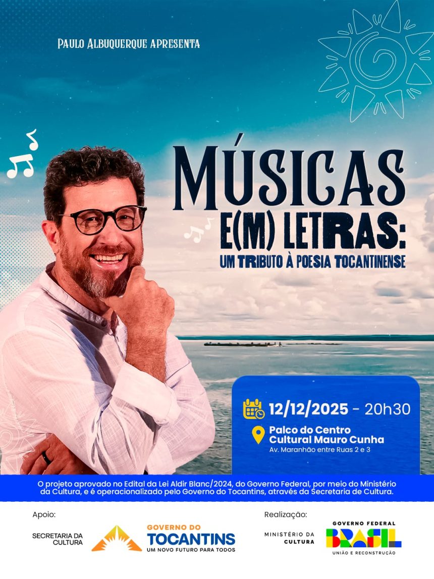 O projeto “Músicas e(m) Letras” foi aprovado no Edital da Lei Aldir Blanc/2024, do Governo Federal, por meio do Ministério da Cultura, e é operacionalizado pelo Governo do Tocantins, por meio da Secretaria de Cultura. A proposta prevê a produção de quatro videoclipes, já em fase de gravação, que celebram as parcerias de Paulo Albuquerque com poetas tocantinenses, além da realização de dois shows abertos ao público.