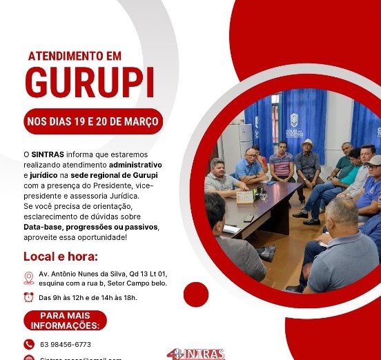 GURUPI-TO – O SINTRAS (Sindicato dos Trabalhadores em Saúde do Estado do Tocantins) informa que está realizando atendimento administrativo e jurídico nesta quarta e quinta-feira (19 e 20/03) na sede regional de Gurupi com a presença do Presidente, vice-presidente e assessoria Jurídica.