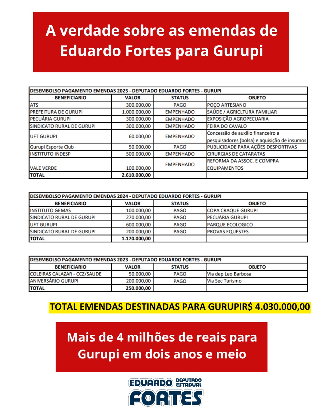 “O meu compromisso com Gurupi é firme e transparente. Tenho respeito pela população e trabalho para que cada centavo das minhas emendas retorne em benefício direto ao povo gurupiense. É lamentável ver pessoas distorcendo a verdade para confundir a opinião pública, mas os fatos falam por si”, destacou Eduardo Fortes.
