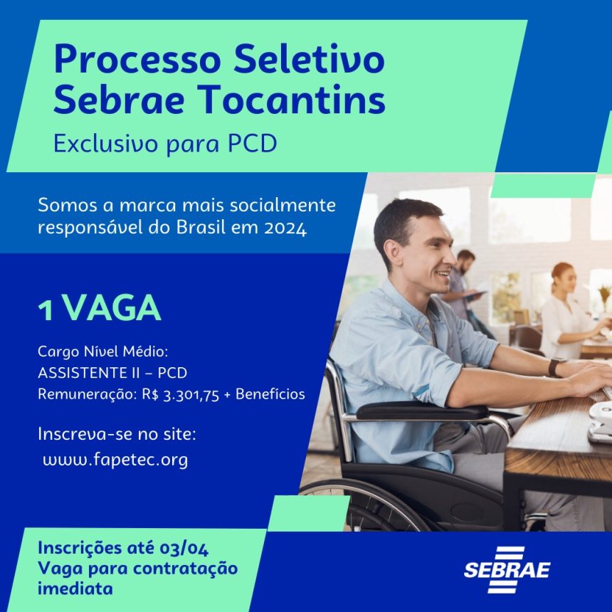 O Sebrae Tocantins abre as inscrições para o cargo de Assistente II, destinado exclusivamente a profissionais com deficiência. Os interessados podem se inscrever até às 18 horas do dia 03 de abril de 2025, por meio do preenchimento do cadastro eletrônico no site da Fapetec (www.fapetec.org).