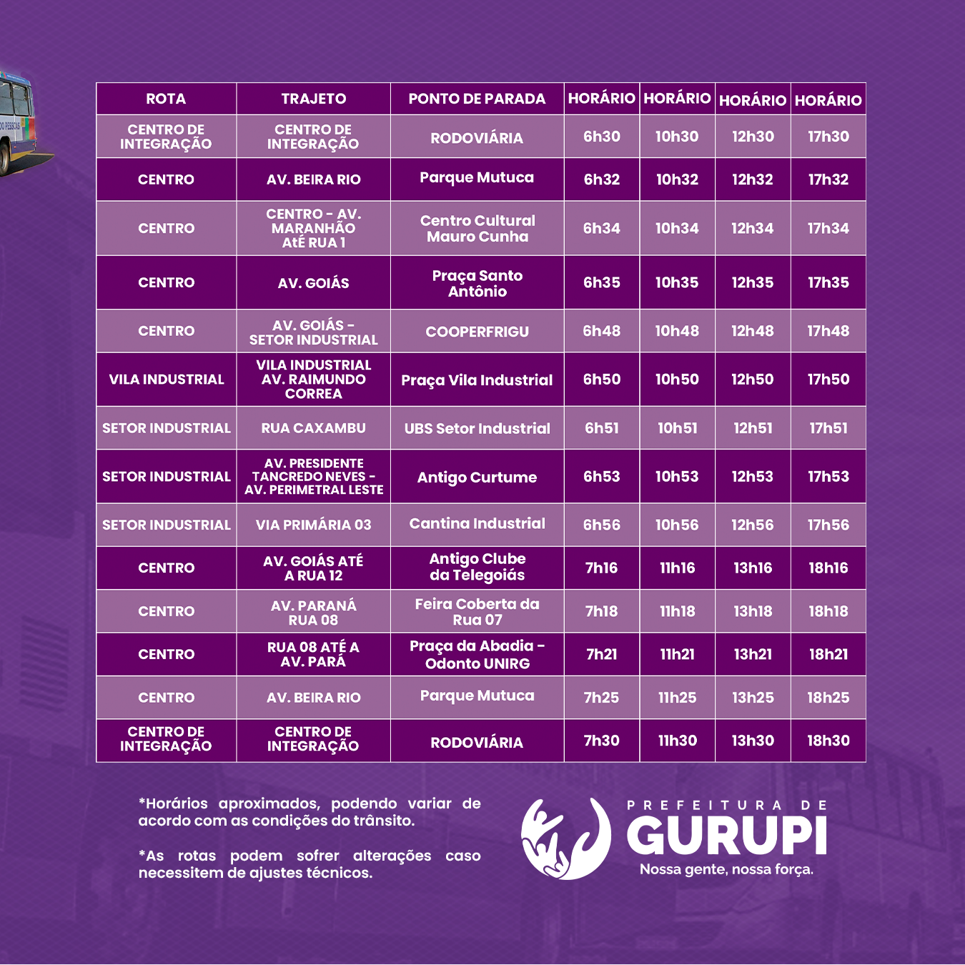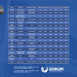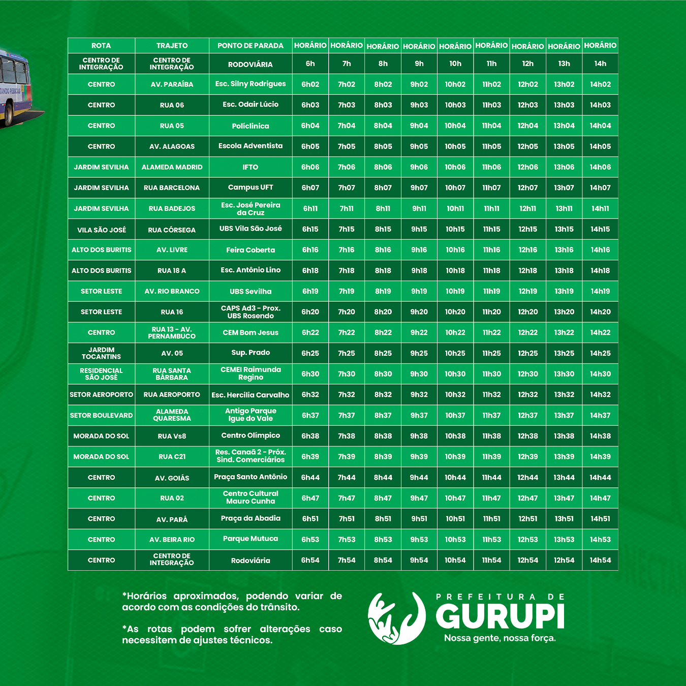A Prefeitura de Gurupi, por meio da Agência Municipal de Trânsito e Transporte (AMTT), em colaboração com a empresa operadora do transporte coletivo, divulga detalhadamente as rotas percorridas pelos ônibus do sistema de transporte público da cidade. Esta iniciativa visa fornecer aos usuários informações precisas sobre as ruas percorridas e pontos de referência ao longo do trajeto.