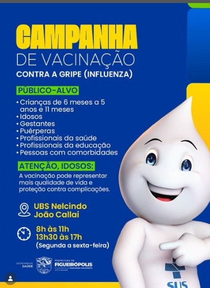 FIGUEIRÓPOLIS-TO – A Secretaria Municipal de Saúde da Prefeitura de Figueirópolis, informa a população e grupos prioritários que está com a campanha de Vacinação contra a Gripe (Influenza) na UBS Nelcindo João Callai, no horário: 8h às 11h e 13h30 às 17h de Segunda a sexta-feira.