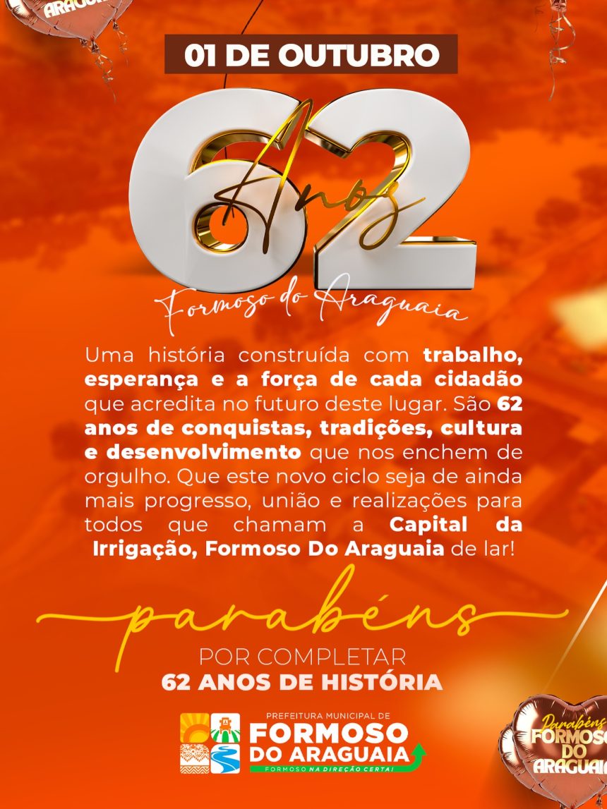 Parabéns, Formoso do Araguaia, pelos seus 62 anos! Que nossa cidade continue crescendo, com prosperidade, união e muito amor pela nossa terra.
