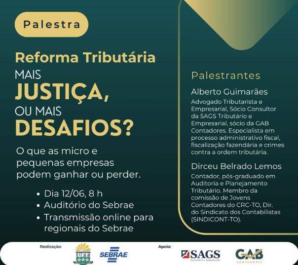 Sebrae Tocantins, em parceria com a Universidade Federal do Tocantins (UFT), realiza nesta quinta-feira, 12, a palestra Reforma Tributária. Mais justiça ou mais desafios? O que as micro e pequenas empresas podem ganhar ou perder. O evento ocorre às 8 horas, no auditório da instituição, em frente à Receita Federal.