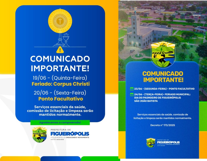 A Prefeitura Municipal de Figueiropolis, decretou e comunica que a quinta-feira, 19 de junho é feriado municipal, e sexta-feira, 20 é ponto facultativo, em celebração ao dia de Corpus Christi. A medida foi publicada através do Decreto 173/2025 que traz ainda (ponto facultativo) no dia 23 de junho e (Feriado Municipal) no dia 24 de junho data que celebra o dia (São João Batista) padroeiro do Município, localizado no Sul do Tocantins.