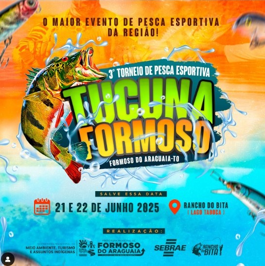 FORMOSO ARAGUAIA-TO – Tudo organizado e planejado pela Prefeitura Municipal, através da Secretaria Municipal de Meio Ambiente e Turismo e parceiros como o SEBRAE-TO e o empresário Bita, para realização do 3º Torneio de Pesca Esportiva Tucuna em Formoso do Araguaia, região Sudoeste do Tocantins que acontece nos dias 21 e 22 de junho no Rancho do Bita.
