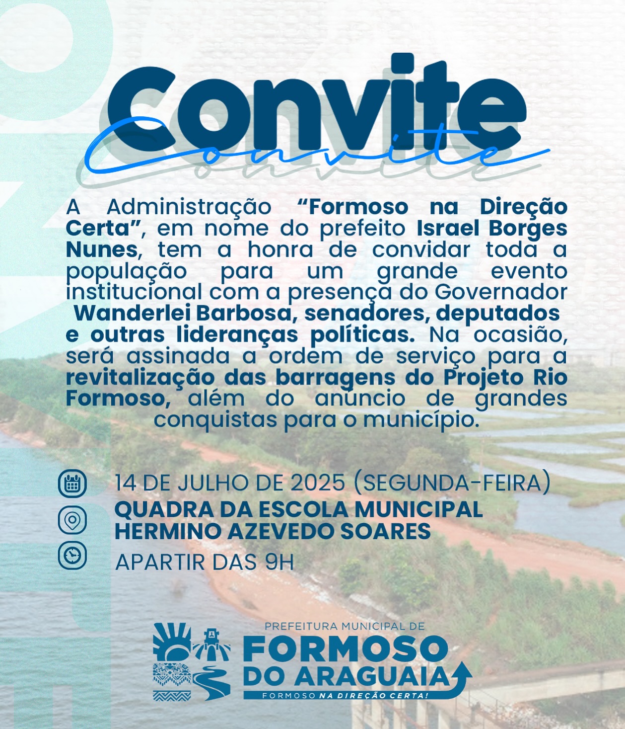 “A Prefeitura de Formoso do Araguaia, por meio da Administração “Formoso na Direção Certa”, convida todos para um grande evento institucional com a presença do governador Wanderlei Barbosa, do 1º Vice-Presidente do Senado, Senador Eduardo Gomes — autor da emenda que garante essa importante conquista para o nosso município — além de senadores, deputados e demais lideranças políticas”, destacou o prefeito Kawe em convite a toda população de Formoso do Araguaia e cidades vizinhas.