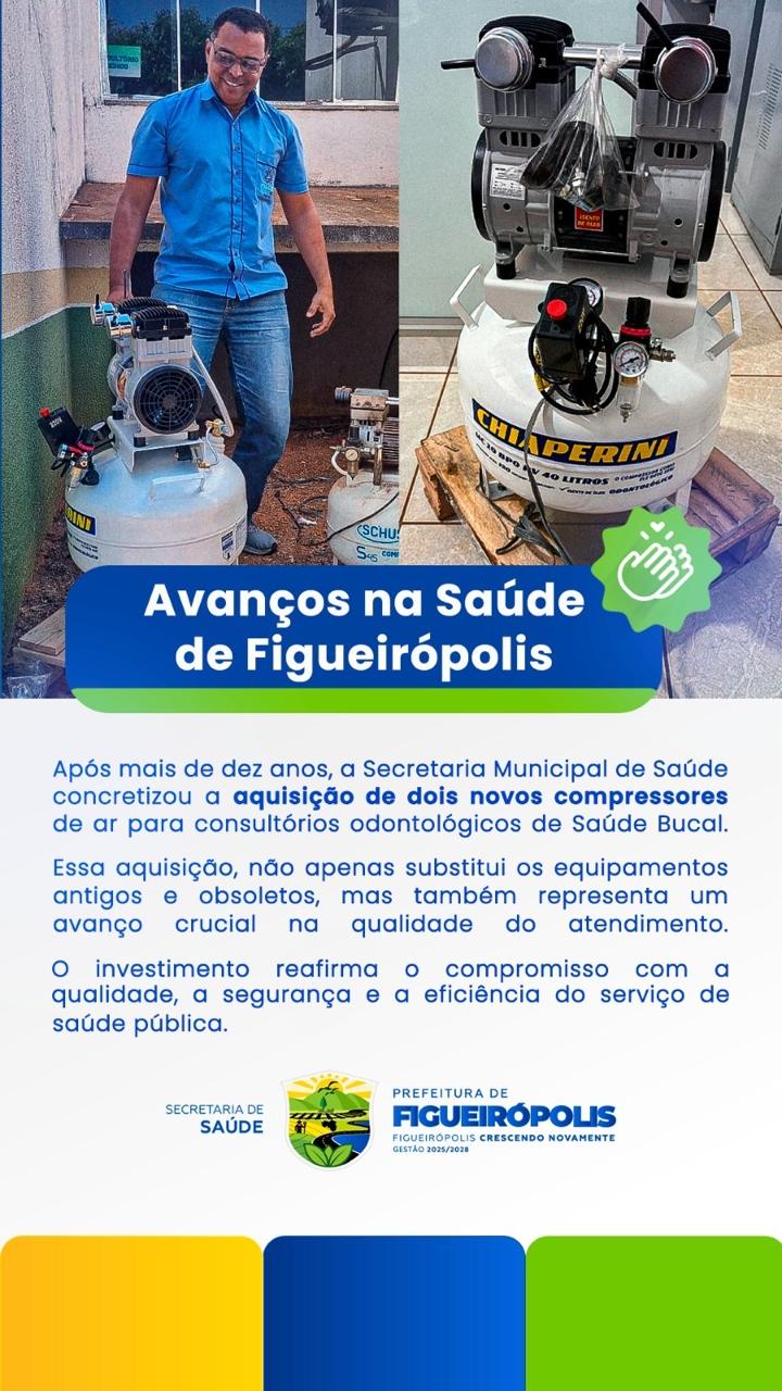 FIGUEIRÓPOLIS-TO – Após mais de dez anos, a Prefeitura de Figueirópolis, através da Secretaria Municipal de Saúde realizou a aquisição de dois novos compressores odontológicos, substituindo equipamentos antigos e obsoletos.