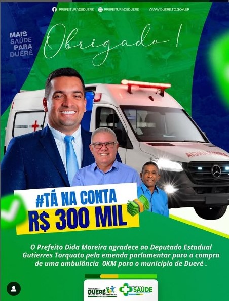 “A prefeitura municipal de Dueré em nome do prefeito Dida Moreira agradece o Deputado Gutierres Torquato @gutierres_gt pela emenda parlamentar para a compra de uma ambulância Zero Km. Obrigado deputado por olhar com tanto carinho para o nosso município”.