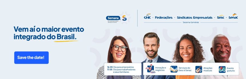 PALMAS-TO – O maior evento integrado do Sistema Comércio brasileiro vai levar cidadania e entretenimento aos cidadãos, além de palestras para incentivar o desenvolvimento e a inovação do comércio e dos serviços no País. A Semana S do Comércio de Bens, Serviços e Turismo, idealizada pela Confederação Nacional do Comércio de Bens, Serviços e Turismo (CNC), será realizada pela Fecomércio-TO, Sindicatos Empresariais, Sesc e Senac, nos dias 16 e 17 de maio, das 14h às 20h, no Espaço Cultural em Palmas.