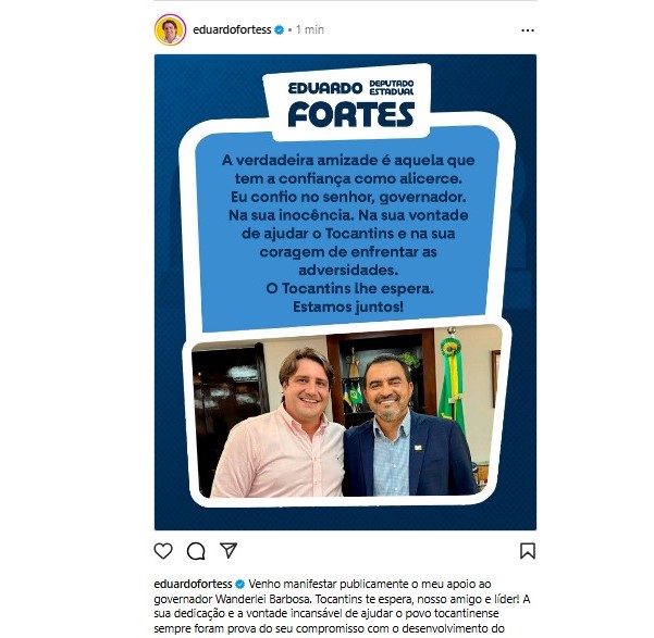 “Venho manifestar publicamente o meu apoio ao governador Wanderlei Barbosa. Tocantins te espera, nosso amigo e líder. A sua dedicação e a vontade incansável de ajudar o povo tocantinense sempre foram prova do seu compromisso com o desenvolvimento do nosso Estado e com a nossa gente”.