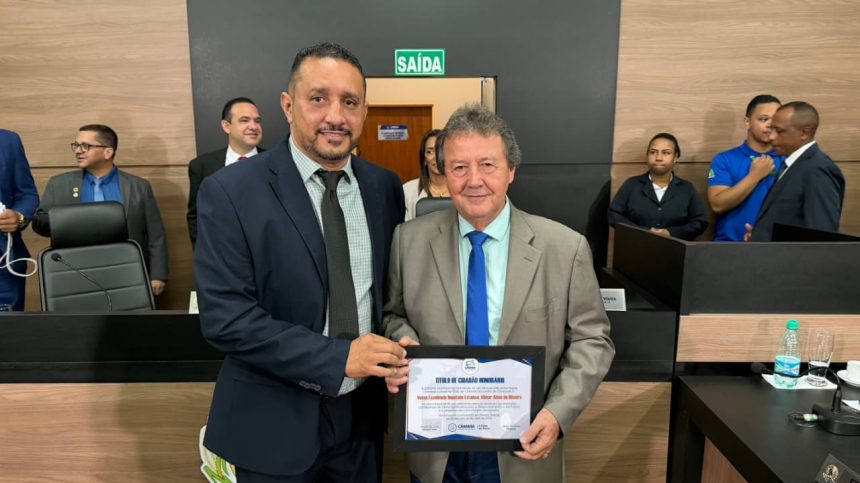 DIANÓPOLIS (TO) – Em sessão solene realizada na noite da quinta-feira (16), o deputado estadual Vilmar (PL) recebeu o Título de Cidadão Honorário, uma das mais altas honrarias concedidas pelo Legislativo Municipal. A homenagem, proposta pelo vereador Manin do Zorra, reconhece o trabalho prestado pelo parlamentar em prol do desenvolvimento do Estado e sua parceria com Dianópolis.