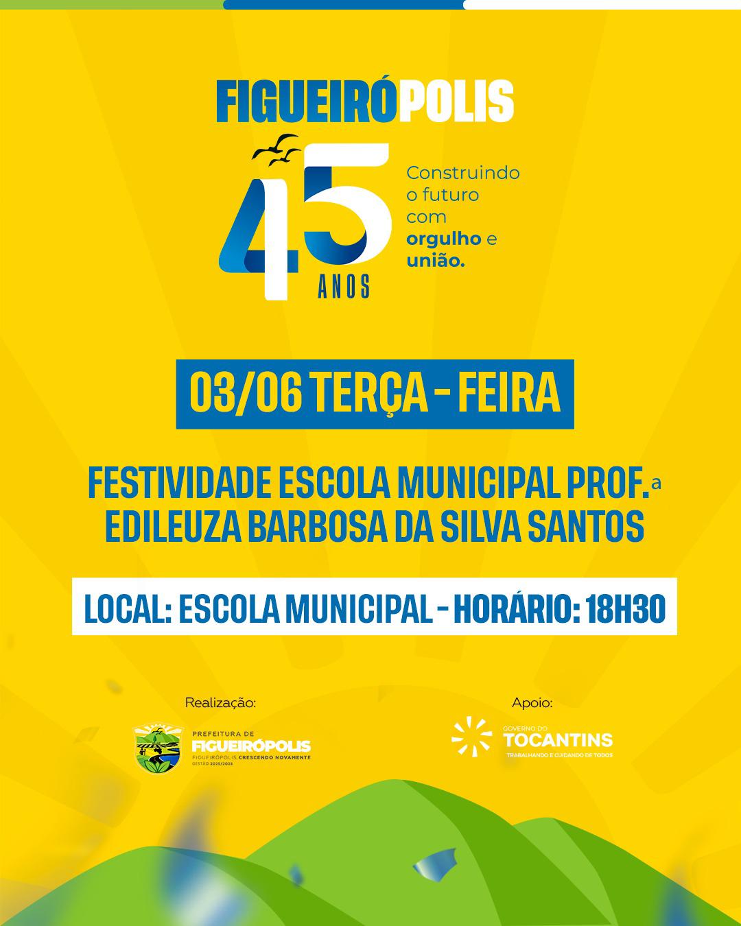 FIGUEIROPOLIS-TO – Uma grande programação nos próximos sete dias (03 a 10 de Junho) comemora o aniversario de Figueiropolis, importante município no Sul do Tocantins que inicia nesta terça-feira (03) logo mais às 18:30h na Escola Municipal Professora Edileuza Barboza da silva Santos.