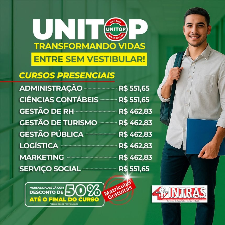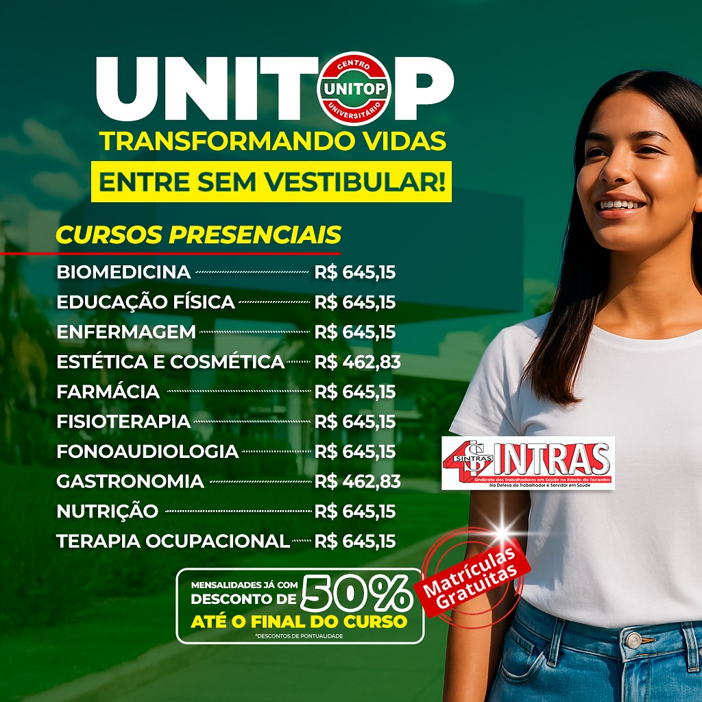O SINTRAS-TO – Sindicato dos Trabalhadores da Saúde do Tocantins firmou mais uma parceria de peso pensando na qualificação e no crescimento profissional de seus filiados! A novidade é o convênio com a UNITOP – Faculdade que oferece ensino superior de qualidade com foco no mercado de trabalho, agora com 50% de desconto nas mensalidades para os trabalhadores sindicalizados ao Sintras.