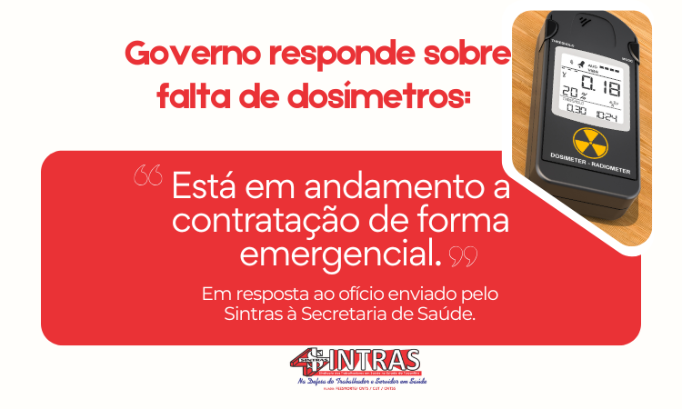 O Sindicato dos Trabalhadores em Saúde do Estado do Tocantins (SINTRAS-TO) recebeu resposta da Secretaria de Estado da Saúde (SES-TO) sobre a falta de dosímetros para profissionais da radiologia nas unidades hospitalares estaduais.