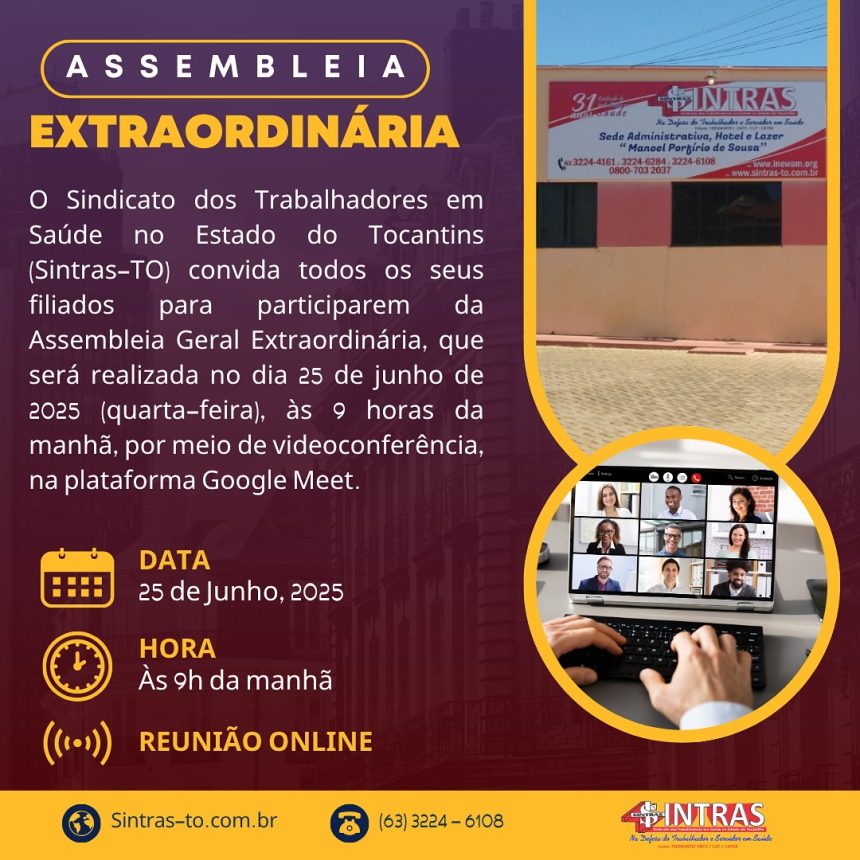 VIDEOCONFERENCIA – O Sindicato dos Trabalhadores em Saúde no Estado do Tocantins (Sintras-TO) convida todos os seus filiados para participarem da Assembleia Geral Extraordinária, que será realizada no dia 25 de junho de 2025 (quarta-feira), às 9 horas da manhã, por meio de videoconferência, na plataforma Google Meet.