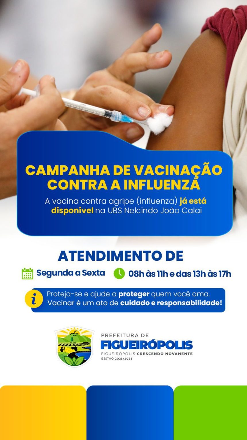 FIGUEIRÓPOLIS-TO – A Prefeitura de Figueirópolis, por meio da Secretaria Municipal da Saúde, iniciou na segunda-feira, 3 de novembro, a Campanha de Vacinação contra a Gripe 2025/2026. A ação segue o calendário do Ministério da Saúde para a região Norte, que realiza a imunização durante o período chuvoso, quando há maior circulação do vírus.
